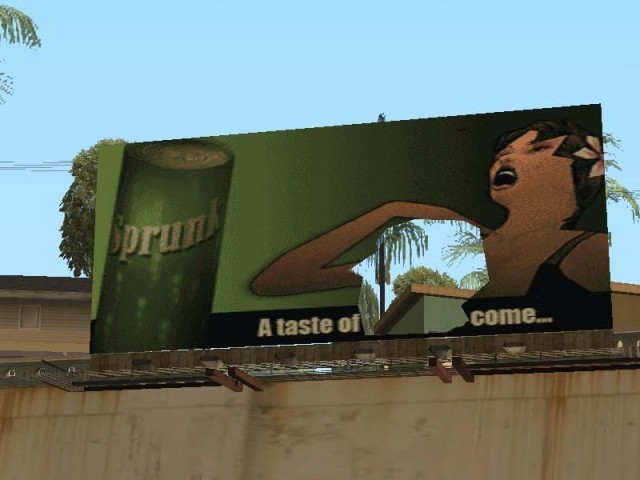 In Gta San Andreas c'è un cartellone pubblicitario della bibita "Sprunk" con la scritta"A taste of things to come". In una missione lo si distrugge e rimane la scritta "A taste of come".