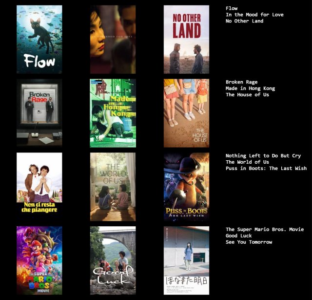 Quest'anno, anzi nella seconda metà dell'anno, ho visto e giocato poca roba. Non me la sento ancora di fare una top dei giochi perchè conto di finire qualcosa che avevo in sospeso prima della fine dell'anno, ma per i film è arrivato il momento di fare una piccola top ahsisi ero in dubbio se mettere come miglior film In the Mood for Love (recuperone importante quest'anno) o Flow. Facciamo che uno è il miglior film d'animazione e uno miglior film così stiamo apposto.
