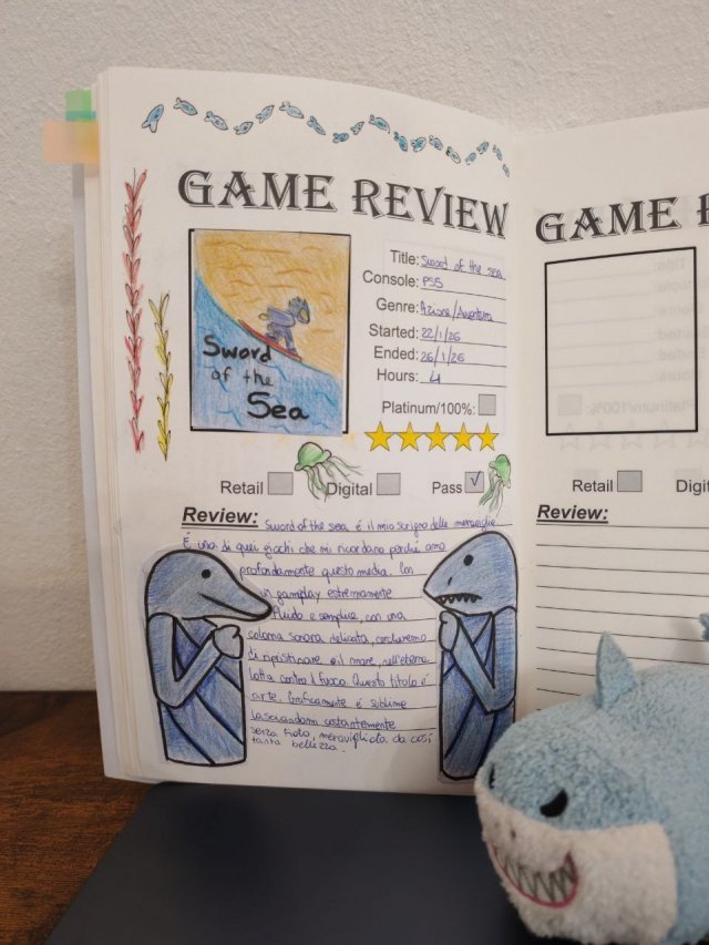 Ci sono giochi che mi ricordano perchè continuo a giocare, perchè li amo così profondamente. Non ho mai nascosto quanto mi fosse piaciuto Abzu. Dalla sua uscita è diventato parte di me, della mia identità qui su ludo. Non ho più cambiato quello squalo, e continuerò a non farlo. Sword of the sea ha di nuovo riacceso quella fiamma, quell'amore per il mare, per gli squali. Mi ha meravigliata, mi ha lasciata a bocca aperta stupendomi ancora una volta. Eppure è un gioco così semplice, così "banale". Ha un gameplay semplice, si fa surf su una spada in maniera fluida, potremmo fare qualche accrobazia mentre esploreremo questo piccolo mondo per ripristinare il mare. A differenza di Abzu è raccontato un po' di più: una continua guerra, due fazioni, un mondo in rovina. Il suo punto forte rimane la componente artistica, accompagnato da una colonna sonora delicata, ci perderemo in un immaginario leggiadro. La fauna marina che prende il volo attorno a noi, non più vincolata al solo mare, ma libera di esplorare il cielo. Una breve avventura che colma e appaga i miei sensi, che mi stupisce e mi incanta.