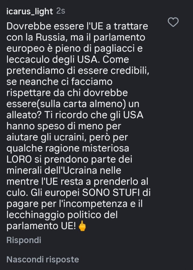 In pratica, non solo il parlamento UE si fa mettere il cazzo in testa da tutti, ma fa pure finta di fare qualcosa cercando di riarmarsi per cercare di fare paura(?) a qualcuno. 🤡