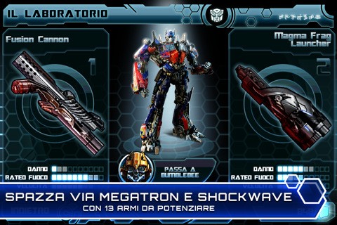 Gioca col grande OPTIMUS PRIME o con l'idolo dei fan, BUMBLEBEE, e impedisci ai diabolici Decepticon di conquistare l'Universo! Distruggi i tuoi nemici in feroci scontri tra robot, o diventa un veicolo e spazza via gli avversari sulla strada. Rivivi le EPICHE ambientazioni del film in 13 intensi livelli – Chernobyl, Atlantic City, Washington D.C., Chicago e persino LA LUNA!