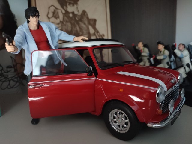 Ryo Saeba con Mini Cooper KK 1:12 scale rigorosamente rossa.Il modello non è propriamente il suo, visto che la sua era anni 60 e questa anni 90, ciononostante stessa scala e colpo d'occhio favoloso! 😁