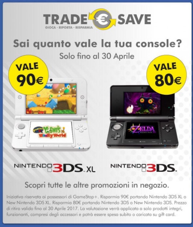 Fino al 30 aprile, GameStop ritira le console Nintendo 3DS e 3DS XL rispettivamente a 80€ e 90€. In particolare il 3DS non mi sembra affatto male come prezzo di ritiro.