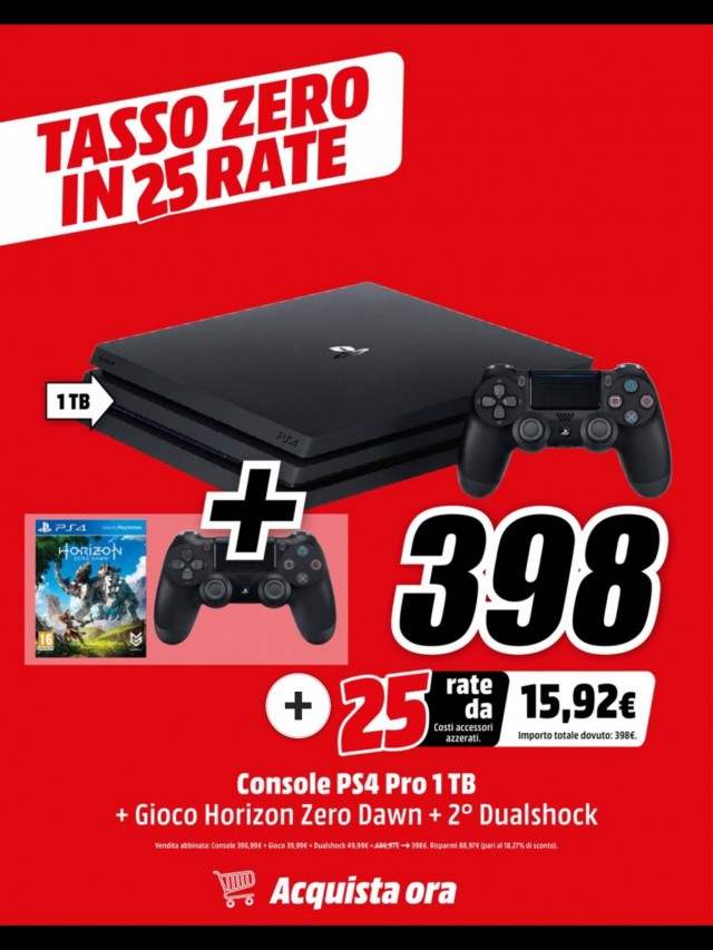 Ps4 Pro + Horizon Zero Dawn + 2° controller (nero, blu, rosso o bianco) - 398,00€: https://www.mediaworld.it/mw/mediaworld- …