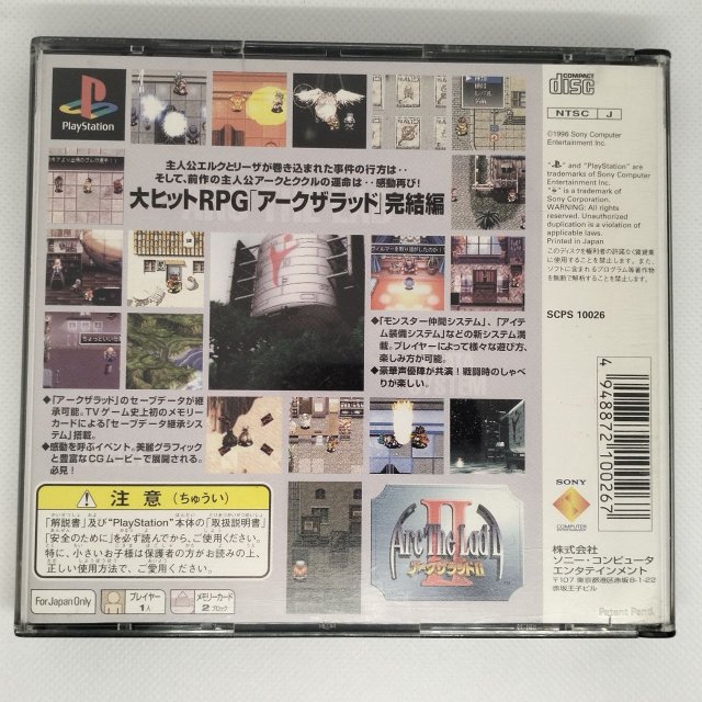 Descrizione: Arc the Lad II è un videogiocodi ruolo tattico sviluppato daG-Crafte pubblicato daSony Computer EntertainmentperPlayStation. Secondo capitolo della serie Arc the Lad , è stato pubblicato solo in Giappone, sebbene sia stato localizzato e distribuito a livello internazionale insieme al suo predecessore e sequel nella Arc the Lad Collection diWorking Designs. La storia continua dal primo gioco, anche se l'attenzione si sposta da Arc a Elc. Si espande rispetto al gameplay del primo capitolo, con un mondo più ampio e un cast più diversificato. Una serie anime è stata realizzata basandosi su questo gioco.