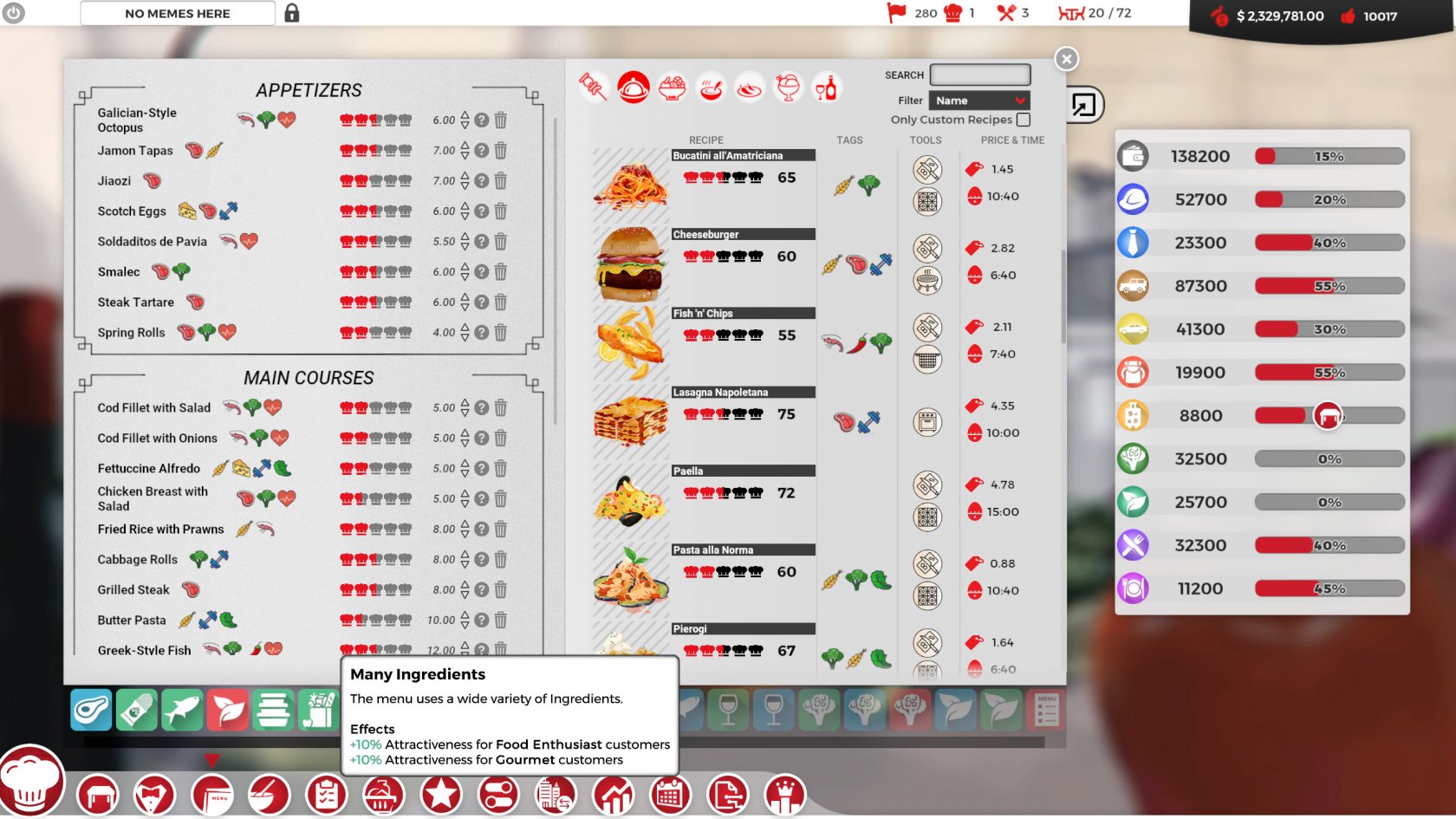 - Completa gestione del tuo ristorante: scegli la planimetria e la posizione del locale, assumi lo staff, metti insieme il menu, decidi le politiche aziendali.