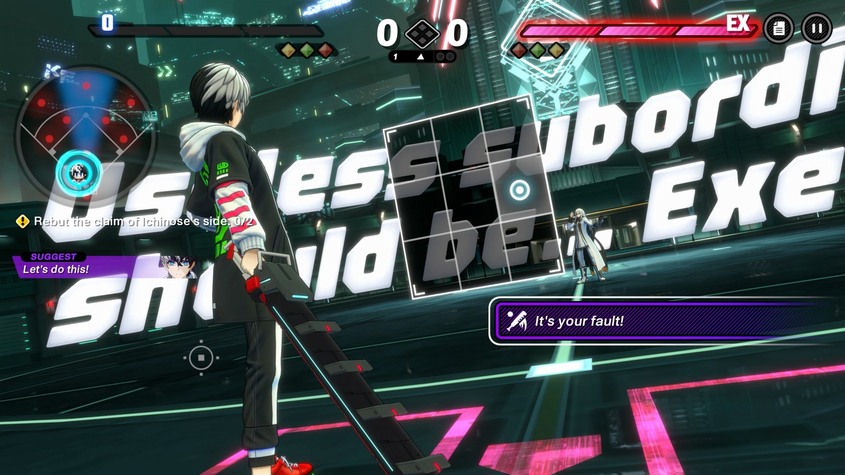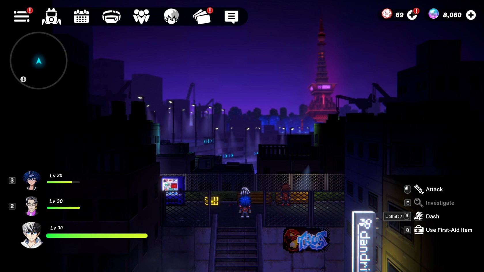 In TRIBE NINE, players progress through the story by controlling characters and exploring Neo Tokyo, encountering battles and various other events on the city streets. Along the way, tasks come in one after another, such as acquiring items from streets and treasure chests, completing puzzles and other mini-games, and fulfilling requests from the town's residents.