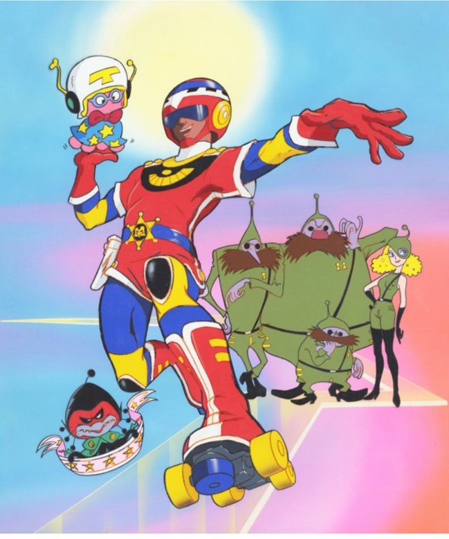Eh se lo ricordassi avrei scritto il titolo del film... Era vestito con la tuta da meccanico blu, ricoperto di elastici colorati in tutto il corpo dalle caviglie alla testa, con la cuffietta in lana con le spille.. e questi pattini a 4 rotelle... Il vestito era una vera pacchianata anni 80