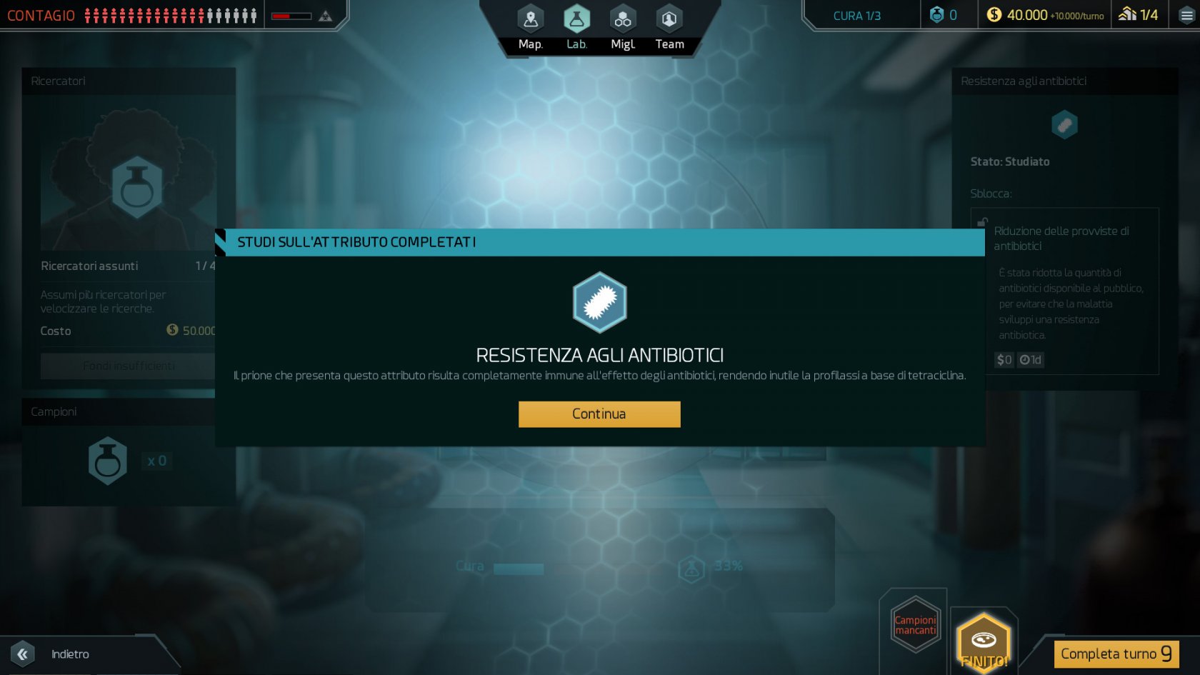 Ovviamente per avanzare nella nostra lotta non dobbiamo tenere conto solo delle questioni più operative, ma ci dovremo occupare dello sviluppo delle nostre tecnologie, spendendo denaro per ottenere alcuni bonus, mentre al tempo stesso studiamo la malattia per poterne produrre una cura sfruttando i campioni raccolti sul campo.