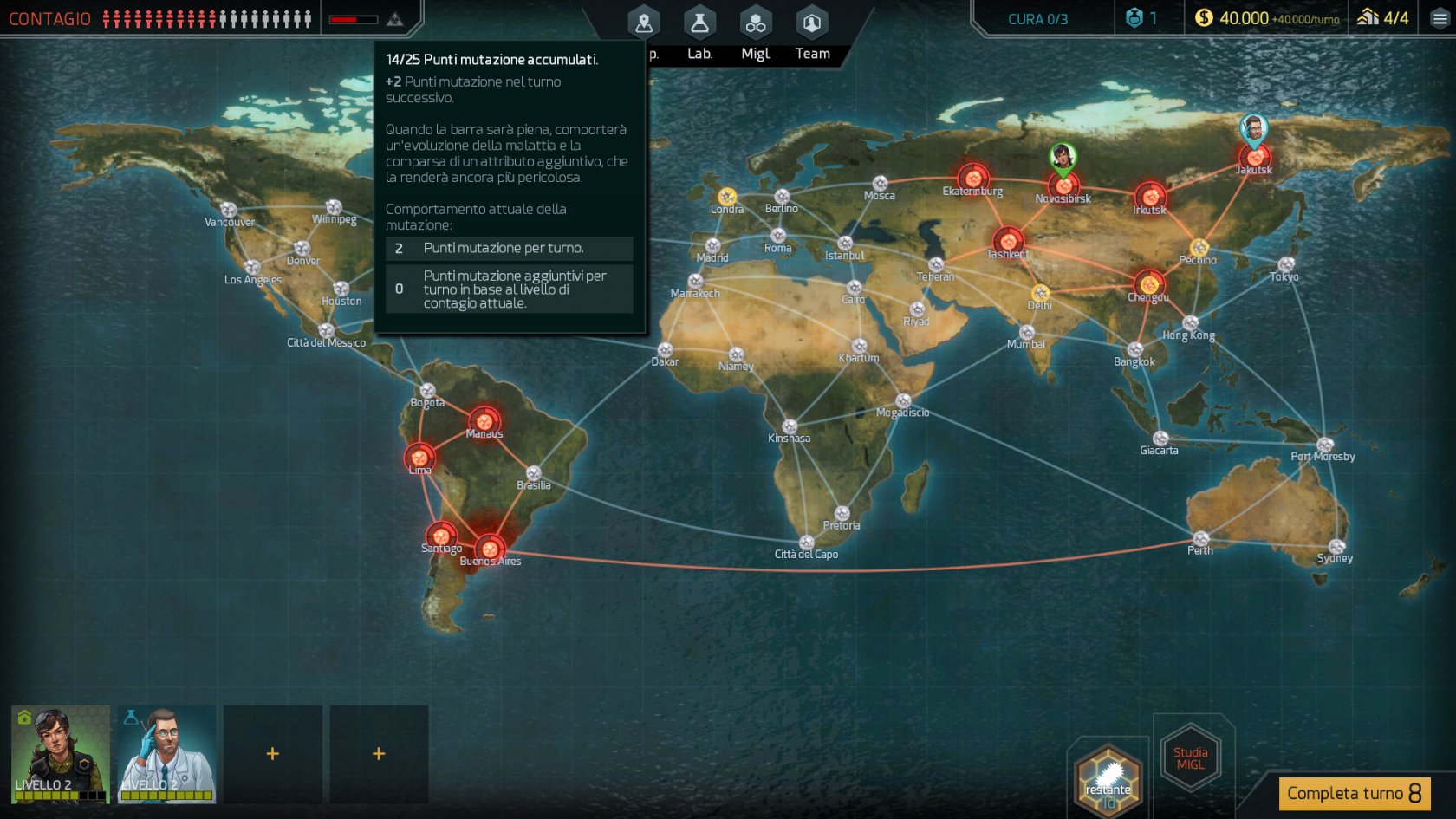 Tutti i nostri sforzi però saranno vani nel caso in cui la pandemia raggiunga il punto critico infettando una percentuale tanto alta di essere umani da impedire qualsiasi contromisura, e attenzione, perché questo punto critico non si raggiunge nel momento in cui tutte le città del mondo sono state infettate, ma varia molto a seconda della difficoltà scelta.