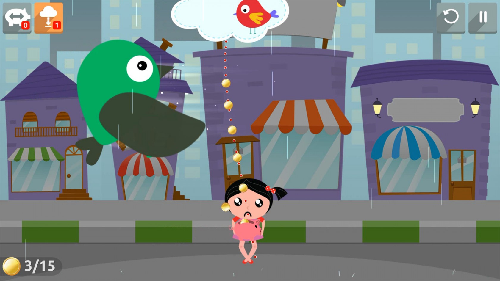 Attraverso quattro “mondi” e decine e decine di livelli, la nostra Eve non se la dovrà vedere solo con il maltempo e la raccolta delle monete, ma dovrà affrontare anche problemi di natura fisica e di ornitologia. Man mano che si procederà verso i livelli più complessi, dovremo fare i conti con alcune distrazioni che potrebbero farci perdere parte del bottino. Tra venti impetuosi, cannoni e rampe, ci troveremo spesso nella situazione di dover studiare attentamente la traiettoria di ogni moneta, evitando così di incappare in un imbarazzante fallimento del livello. Per completare i vari scenari sarà necessario raccogliere più della metà delle monete che verranno erogate; più ne verranno raccolte, più alta sarà la valutazione. Parlando dei volatili, questi contribuiranno sia a rendere le cose ancora più difficili, sia a donarci bonus utilissimi. Alcuni finiranno per rubarci letteralmente alcune monete, mentre alti ci forniranno preziosi aiuti per completare i livelli.
