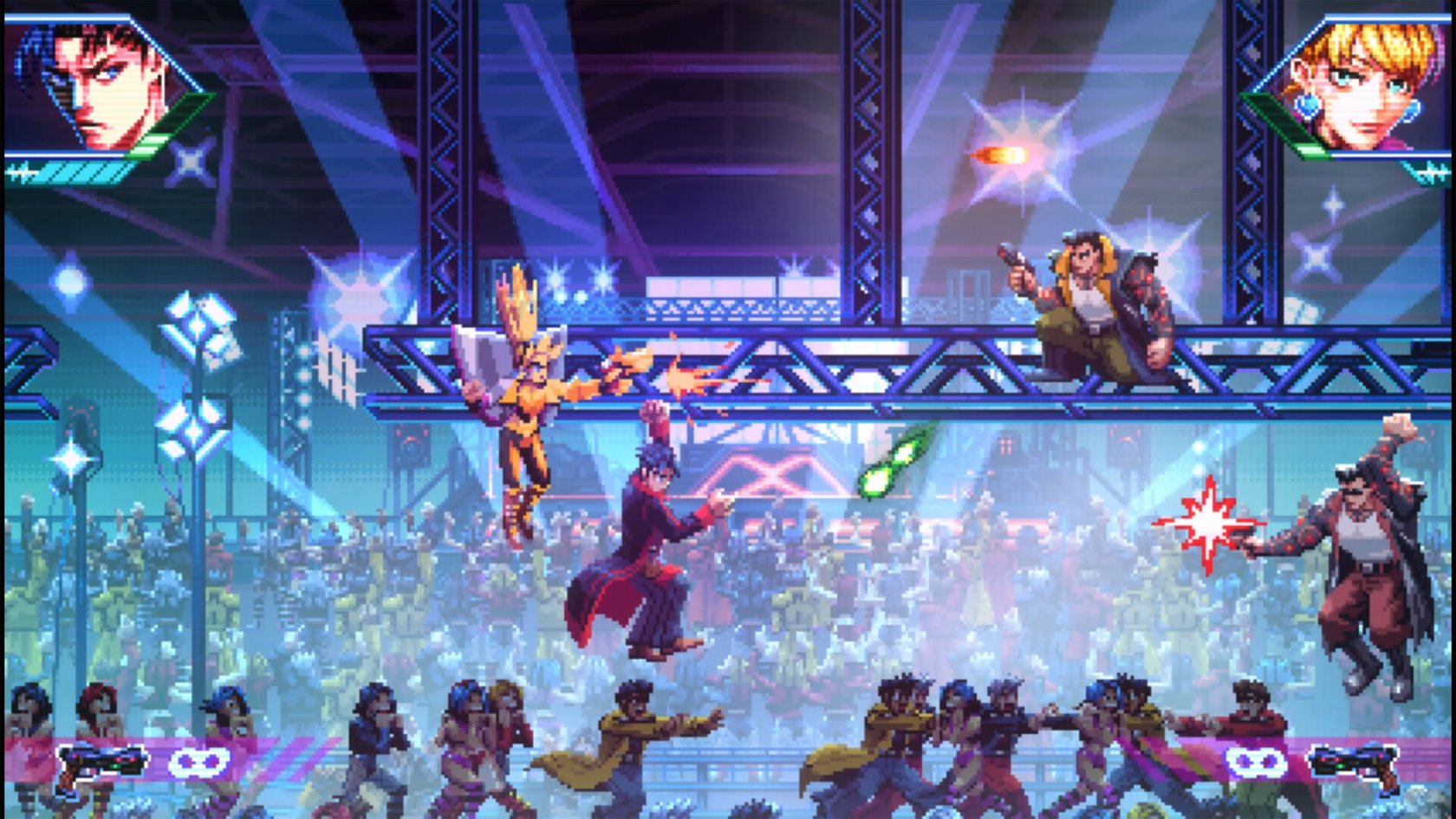 Visivamente, Neon Inferno è un'esplosione di colori saturi, luci al neon e pixel art dettagliatissima. Ogni livello è un quadro cyberpunk, con sfondi animati, effetti particellari e una palette cromatica che alterna il viola elettrico al rosso sangue. L'ispirazione agli anni Ottanta è evidente, ma non si tratta di semplice nostalgia: c'è una cura per la composizione, per il ritmo visivo e per la leggibilità dell'azione che dimostra una grande consapevolezza estetica.