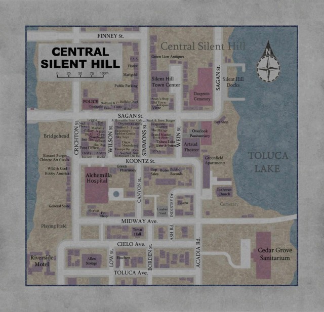 Mappa che riguarda solo Central Silent Hill, locazione dove si svolge TUTTO Silent Hill: Origins, le sezioni a Silent Hill di Homecoming e meta di Harry Mason per raggiungere l'Alchemilla Hospital nel primo episodio.