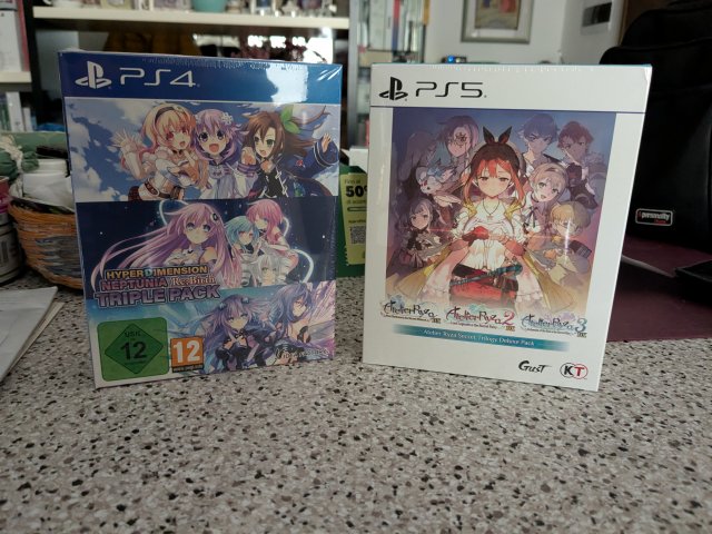 Oggi porto la trilogia di Neptunia Rebirth e la trilogia di Atelier Ryza. La prima è un porting/remaster della versione psvita, a sua volta versione migliorata della versione ps3. Cosa ridicola su nitendo switch è uscita solo in asia con l'inglese, si torna alla censura e non è mai una bella cosa. Mentre su ps4 è uscita pure pal, sia singole che con cofanetto. Lato positivo le collector asiatiche su switch sono molto più belle del box qui presenete, ma ehi costano anche di più. Mentre la trilogia ps5 di Ryza contiene i 3 giochi nella versione DX, ossia migliorata e con tutti i dlc. Qui si poteva pure prendere la versione nipponica perchè ha l'inglese dentro, ma ho preferito l'asiatica per avere le cover in inglese, il prezzo poi era più o meno quello.
